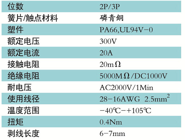 接線端子的絕緣材料用改性的尼龍(PA66),能達到或超過IEC947-7-1EN60947-7-1標準,阻燃等級達到UL94V-0具有良好的電氣性能和機械性能。螺絲用高強度的鋼制成鍍鋅或鎳處理,導電體四方針用合金銅制成表面鍍錫,壓片采用彈性及極強的磷青銅表面鍍錫或鎳;壓線框用抗應力裂縫腐蝕的合金銅制成,這些金屬表面還鍍錫或鍍鎳加以保護。設計完全符合IEC60947-7-1.GB14048.7等標準。