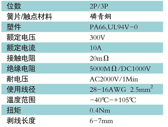 接線端子的絕緣材料用改性的尼龍(PA66),能達到或超過IEC947-7-1EN60947-7-1標準,阻燃等級達到UL94,V-0具有良好的電氣性能和機械性能。螺絲用高強度的鋼制成鍍鋅或鎳處理,導電體四方針用合金銅制成表面鍍錫,壓片采用彈性及極強的磷青銅表面鍍錫或鎳;壓線框用抗應力裂縫腐蝕的合金銅制成,這些金屬表面還鍍錫或鍍鎳加以保護。設計完全符合IEC60947-7-1.GB14048.7等標準。